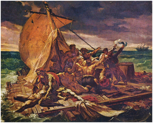 „Das Floß der Medusa“ ist ein Gemälde von Théodore Géricault ist mit 4,91 m x 7,16 m, also ca. 35 m2, von beeindruckender Größe. Géricault wird der französischen Romantik zugeordnet, ebenso wie Eugène Delacroix. Während dieser in dem bekannten Bild „Die Freiheit führt das Volk“ –