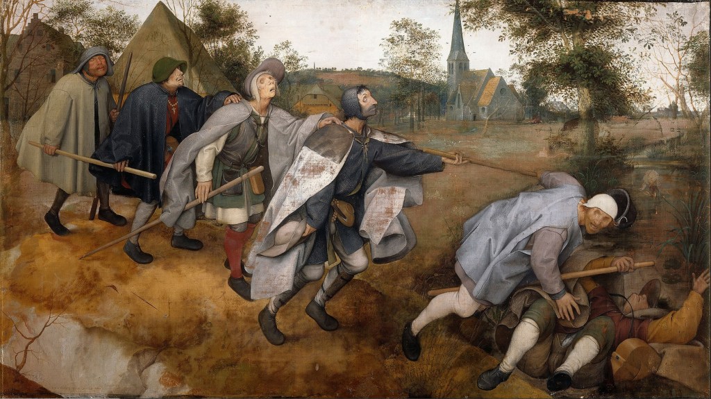 Dieses Bild von Pieter Brueghel dem Älteren, ist mir im Laufe meines Kunststudiums begegnet, ohne dass ich allzuviel damit anfangen konnte. Gut, ein Bild auf dem nacheinander Menschen zu Fall kommen, weil sie ohne Augenlicht sind, sich aneinander festhalten und sich gegenseitig nicht helfen können. Kunstvoll gemalt allerdings, ein alter Schinken.