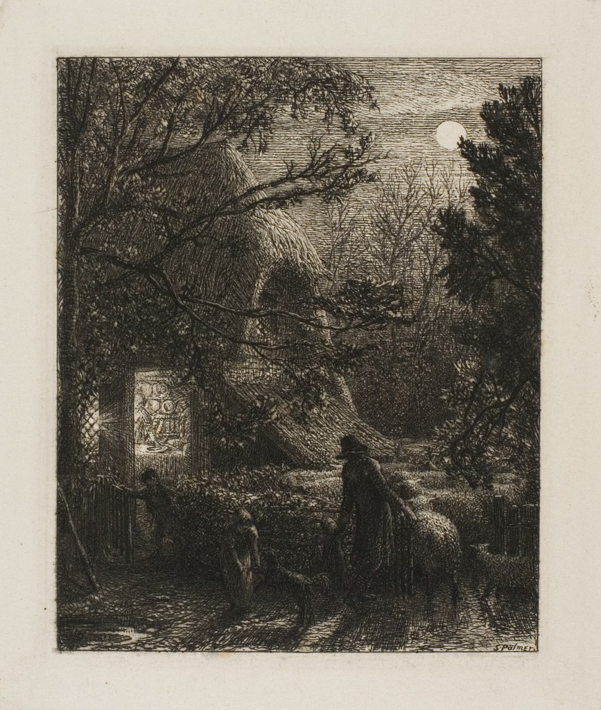 Der Maler und Graphiker Samuel Palmer, der von 1805 bis 1881 in England lebte, schuf diese Radierung 1850. Das Bild wirkt auf den ersten Blick überhaupt nicht weihnachtlich. Sehr dunkel, außer dem Vollmond mit nur einer Lichtquelle und nur schemenhaft sichtbaren Figuren. Der Titel „Weihnachten“ enthält jedoch einen eindeutigen Arbeitsauftrag an den Betrachter, sich etwas anzustrengen.