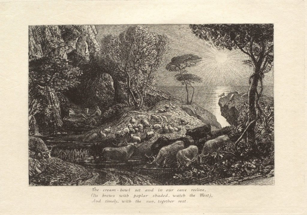 Ein kleiner Umweg über Vergil, dessen Ekloge, mit dem Zweitnamen »Bucolica«, Palmer illustrierte, führt ebenfalls erst zu Schafen und dann zu Schäfern. Bukolische Schriften und Texte enthalten seit der Antike Hirtenszenen als idyllische Landschaftsdarstellungen, die ländliche Einfachheit und Ruhe ausstrahlen. »Locus Amoenus« oder »Arkadien« wurden diese Landschaften genannt, die christlich um die Vorstellung eines Garten Eden erweitert wurden. Der ab dem Barock hinzugetretene Aspekt von »Schäferspielen« kann hier ausgeschlossen werden. Die vierte Ekloge Vergils enthält die Ankündigung eines göttlichen Kindes, die später christlich umgedeutet wurde und die Weihnachtsgeschichte vorwegnahm. Selbstredend befinden sich Schafe und Schäfer auf all diesen Illustrationen Palmers.
