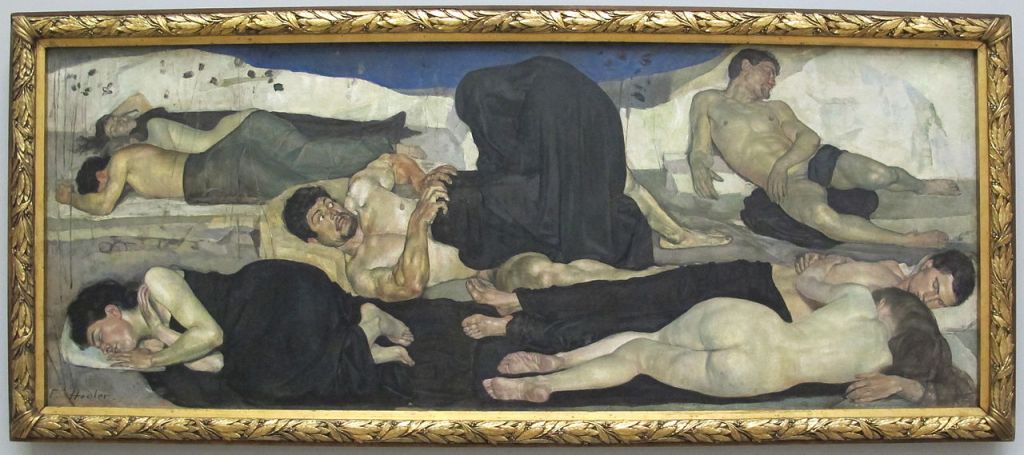 Für beinahe programmatisch halte ich die beiden Bilder »Die Nacht« und »Der Tag«. Auf dem Bild »Die Nacht« von 1899 sieht man mehrere Personen, teilweise schlafend, liegen. Die parallele Anordnung ist im Symbolismus und besonders bei Hodler eine häufiger anzutreffende Kompositionsweise. Auf dem Mann in der Mitte hockt eine schwarz verhüllte Figur, die nur den Tod symbolisieren kann. Der Mann, der Hodler selbst ähnelt, reagiert mit einem panischen Blick und einer deutlich formulierten Abwehrgeste. Das dem Symbolismus zugeschriebene Thema »Tod« kommt hier ebenso zum Tragen, wie Hodlers Lebensgeschichte. Seine Eltern waren der Reihe nach an Tuberkulose (damals Schwindsucht) gestorben. Als er mit seinen vier jüngeren Geschwistern alleine war, starben auch diese an derselben Krankheit.