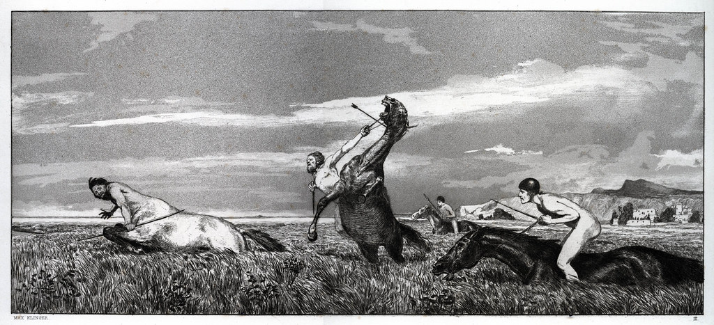 Neben diesen beiden Materialgruppen schuf Klinger ein umfangreiches graphisches Werk, von ihm »Griffelkunst« genannt, das durchweg als symbolistisch bezeichnet werden kann. In mehreren Zyklen, die er jeweils »Opus« nennt, setzt er fast ausschließlich mythologische Themen um. Die Neue Pinakothek veranstaltete 2020 eine Ausstellung zu diesem Themenkomplex, die immer noch im Netz dokumentiert ist. https://www.pinakothek-der-moderne.de/ausstellungen/max-klinger/ Hier ein Beispiel aus der Kunsthalle Kühlungsborn, der »Verfolgte Centaur.«