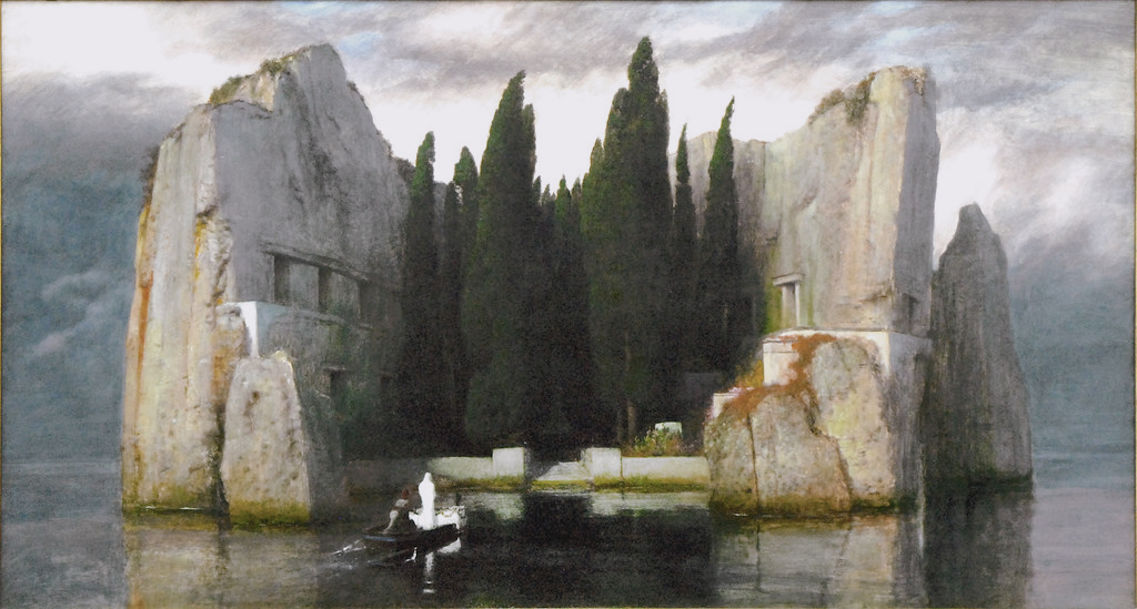 Von der »Insel der Seligen« existiert eine ganze Reihe von Versionen, die von 1893 aus der Nationalgalerie in Berlin ist sehr eindrucksvoll, zumal Böcklin über der rechten Grabkammer seine Initialen hinterlassen hat.
