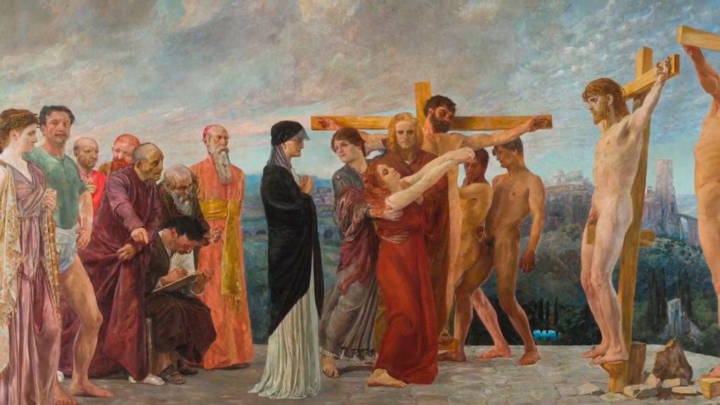 Die gemalten Bilder geben größtenteils mythische und christliche Themen wieder. Das frühe Monumentalbild von der Kreuzigung Jesu löste einen Skandal aus. Zunächst wurde Jesus, neben den anderen Gekreuzigten, vollkommen nackt dargestellt. Das widersprach den religiösen Vorstellungen, scheint aber realistisch zu sein, denn zu seinen Füßen wurde und die Kleider gewürfelt. Außerdem ist der Gekreuzigte nicht in der dominanten Mitte des Bildes, sondern auf der rechten Hälfte. In der Bildmitte ist die vor Trauer ohnmächtig werdende Maria Magdalena. Weiter Links steht Maria und hält Blickkontakt mit Jesus. Links ist eine Gruppe mit Zuschauern, von denen einer die Szene skizziert und als getreuer Zeuge die Kreuzigung im Bild festhält. Ich sehe hierin Klingers eigene Position.