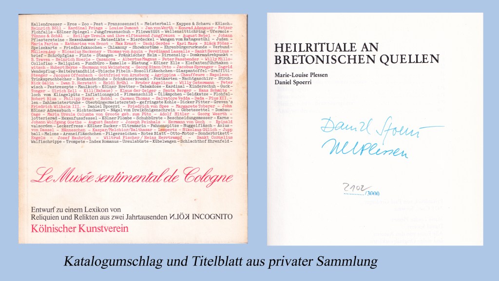 Während seiner Professur an der Kölner Werkschule führte Spoerri diese Ideen weiter, indem er z.B. zu einem Menü einlud für einige Menschen, die zufällig einen berühmten Namen hatten. Der Dekan des Fachbereichs Karl Marx, der natürlich auch anwesend war, mag ihn dazu inspiriert haben. Während seiner Kölner Zeit realisierte Spoerri noch weitere Projekte, wie neue Kunst-Kochbücher, eine Ausstellung Musée Sentimental de Cologne im Kunstverein. Mit seinen Studenten schuf er eine Sammlung alltäglicher stadtbezogener Gegenstände die die Idee einer »Geschichte von unten«, also aus er Sicht normaler Menschen statt historischer Ereignisse., bildnerisch untermallten. Gezeigt wurden z.B. Bleistiftstummel von Heinrich Böll oder Adenauers Rosenschere. Die Idee der Fallenbilder wurden so auf eine ganze Stadt erweitert. Erstmals realisierte Spoerri diese Idee in Paris, die Kölner Ausstellung war dann wesentlich ausführlicher. Ich sehe auch hier einen Realismus, der in seiner Art wieder neu ist. Einen Bildband mit dem Titel „Heilrituale an Bretonischen Quellen“ mit einer Auflage von 3000 Stück verschickte er an Personen, die ihm zuvor irgendein Buch zukommen ließen. Aus den Büchern wollte er eine Zufallsbibliothek zusammenstellen.