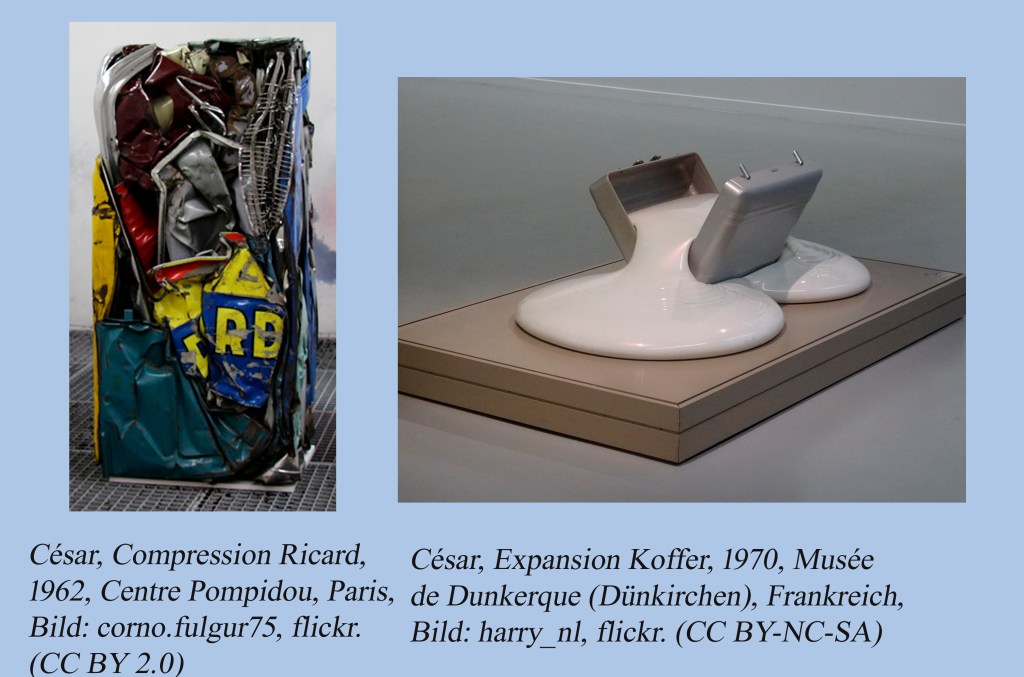 In den sechziger Jahren begann er seine « Compressiones », die gequetschten Metalle. Über das Gründungsmitglied der »Neuen Realisten«, Pierre Restany kam er zu der Erkenntnis dass seine Arbeiten eine Weiterentwicklung von Duchamps Ready‑mades seien, «Objets plus». ( Duchamp, der in vielerlei Hinsicht die Voraussetzungen für die Neuen Realisten schuf, erwähnte ich in dem Blog über Außenseiter und Einzelgänger vom 10. Oktober 2021.) Martina Meister zitierte César am 17.02.2018 in der »Welt«, „ich bin ein Bildhauer in der Tradition. Ich bin, wie meine Mutter sagte, Michelangelo oder Rodin. Ich bin zugleich Duchamp oder Man Ray.“ “Ein klassischer Bildhauer, der die Welt auseinandernahm“, fügte sie noch hinzu.