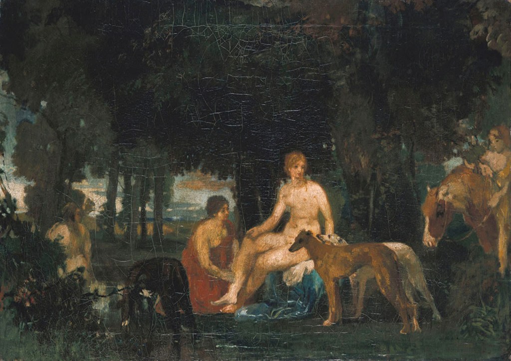Eine Erweiterung sind Bilder mit Personen in Landschaften, Die »Rast der Diana« stammt aus demselben Jahr wie das Doppelportrait. Trotz der Diana ist es kein Historienbild, eine gegliederte Gruppe von Menschen und Tieren vor einem Wald mit verschwindenden Farben. Die Unsauberkeit seiner Palette und Pinsel, die Steffek noch bemängelte, schien ihm hier zufriedenstellende Dienste zu erweisen. Trotz der Qualitäten des Bildes, wirkt de Blick durch die Bäume auf den Hintergrund wie ein unpassendes Loch.