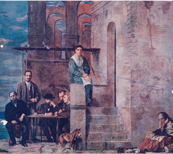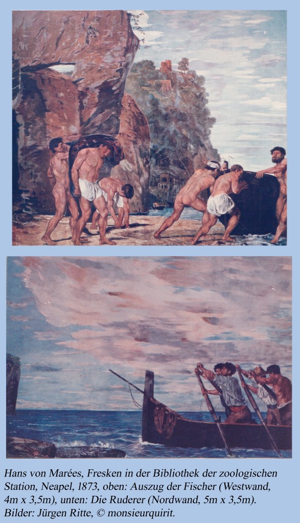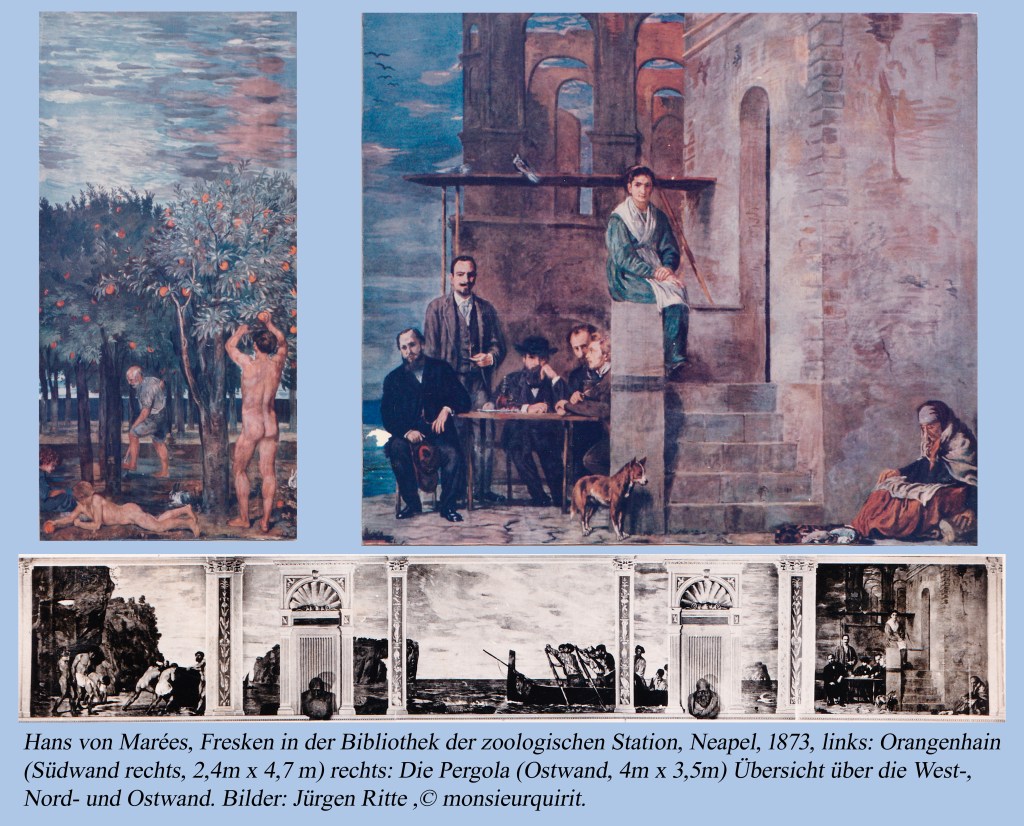 Marées fertigte in kurzer Zeit die Fresken an sämtlichen Wänden an. Sein Freund Adolf von Hildebrand gestaltete die Raumplastiken, die mit den Fresken eine gestalterische Einheit bildeten, was man Jahrzehnte später als „Gesamtkunstwerk“ bezeichnete. Dieses erste noch wenig schlagkräftige Indiz für die Einordnung Marées in die Epoche der Moderne wird gestützt aus der scheinbar nebensächlichen Tatsache, dass diese zoologische Station eine Errungenschaft der erst seit kurzem in den Fokus gerückten und damit modernen Naturwissenschaften war. Schließlich sind es die Arbeiten selber, die den Übergang aus der Vergangenheit zu neuen Ausdrucksformen zeigen. Das Fresko auf der Ostwand, »Die Pergola« zeigt mehrere Personen von einem perspektivisch wiedergegeben Gebäudekomplex. Allerdings folgen die Fluchtlinien nicht den Gesetzen der Perspektive, sie überschneiden sich nirgendwo in einem einzigen Fluchtpunkt. Die Eroberung des Raumes durch eine korrekte perspektivische Darstellung in der Renaissance wird der Fotografie überlassen. Die Impressionisten verzichten fast gänzlich auf diese Darstellungsform, ebenso, wie Marées, der räumliche Elemente hier hintereinander staffelt, wie später auch Beckmann.
