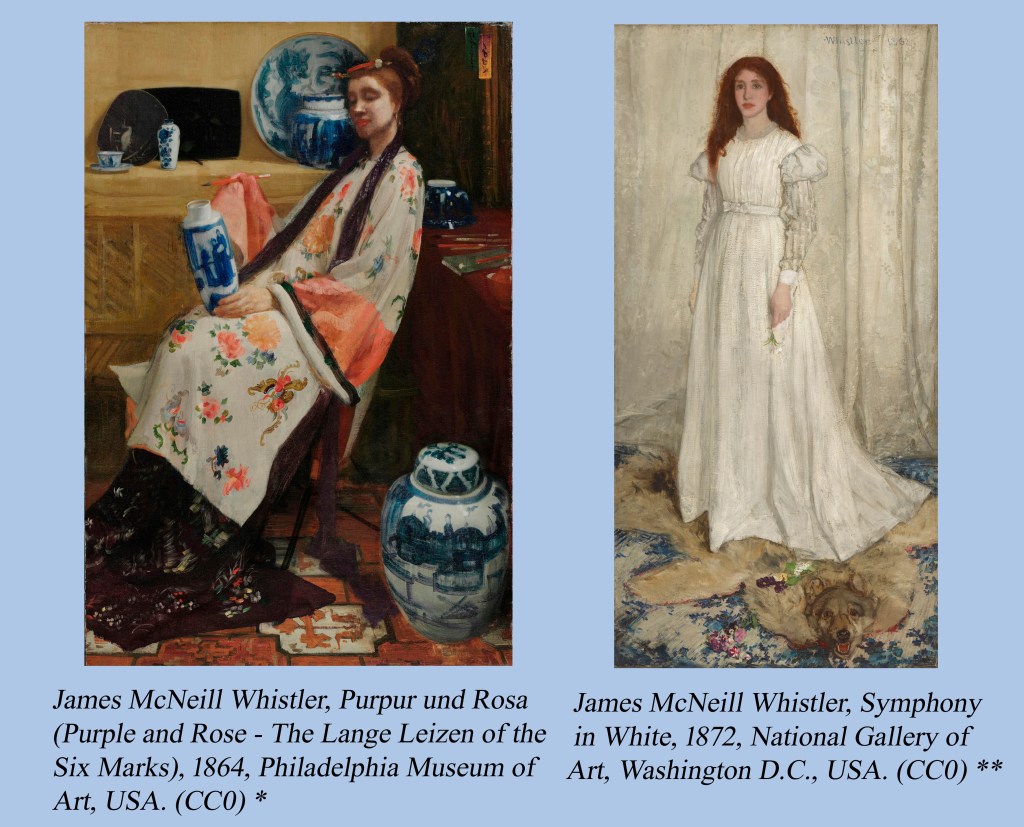 James McNeill Whistler (1834 – 1903) blieb aus heutiger Sicht eher im Hintergrund, obwohl er zu seiner Zeit wohlbekannt, aber nicht immer unumstritten war. In Amerika geboren ließ er sich 1855 in Paris nieder, studierte neben Monet, Renoir und Sisley bei einem gemeinsamen Lehrer. Befreundet war er u.a. mit Corot. Japanische Kunst, besonders Holzschnitte wurden ab den 60er Jahren zu Anregungen für viele französische Künstler. Neben Pierre Bonnard, Paul Serusier, Gauguin und Van Gogh ebenfalls für McNeill Whistler, der wiederum Marianne von Werefkin während ihrer Zeit in Russland begegnete und in Richtung japanischer Darstellungsformen beeinflusste.