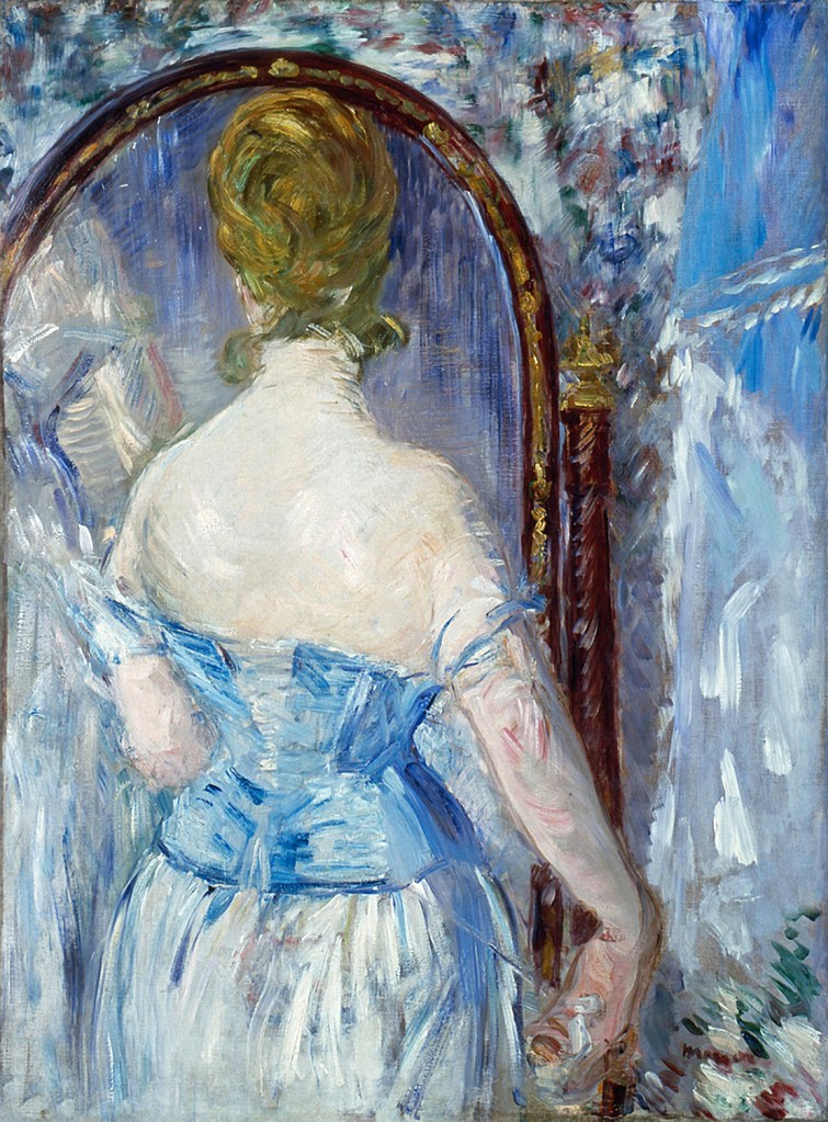 Die beiden Frauen stammten aus Manets Nachbarschaft, ihre Namen sind bekannt. Manet hat, wenn er mit Modellen arbeitete, die Personen zügig in einer Sitzung gemalt. Für Feinheiten war dabei keine Zeit, die Pinselstriche bleiben sichtbar. Überkommene Vorstellungen, wie Bilder zu sein haben, interessierten ihn nicht. So vermeidet zum Beispiel die dunkle Wand jede Illusion von Räumlichkeit. Wie bei den vorherigen Bildern lässt er gliedernde Schattierungen bei dem Köper weitestgehend weg, nur zu den Rändern hin wird er dunkler, eine sehr moderne Methode, einen Körper doch noch plastisch erscheinen zu lassen. Die wenigen Schatten sind farbig, je nach Beleuchtung. Manet strebte an, das zu malen, was er sah und nahm keine Rücksicht auf Konventionen. Alles das waren Verfahren, die die Impressionisten, die sich bereits um Manet scharten, übernahmen und weiterentwickelten.