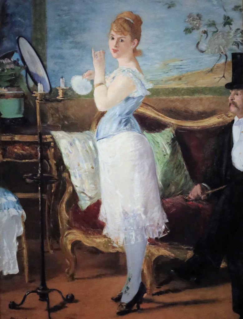 Mit »Nana« stellt er eine weitere Prostituierte vor. Man sieht sie von der Seite im Unterkleid beim Schminken in voller Größe auf der Zentralachse des Bildes. Ein wartender Herr in Ausgehkleidung wird auf einem Sofa sitzend von Bildrand abgeschnitten und so zum unbedeutenden Accessoire degradiert. Die zwei Personen sind trotzdem nicht alleine, Nana wendet sich selbstbewusst zur Seite aus dem Bild heraus und bezieht so den Betrachter mit in das Geschehen ein. Ein Flirt, wie man ihn auch bei der »Olympia« interpretieren muss. Émile Zola greift die Figur in seinem Roman «L’Assommoir», deutsch »Der Totschläger«, auf.