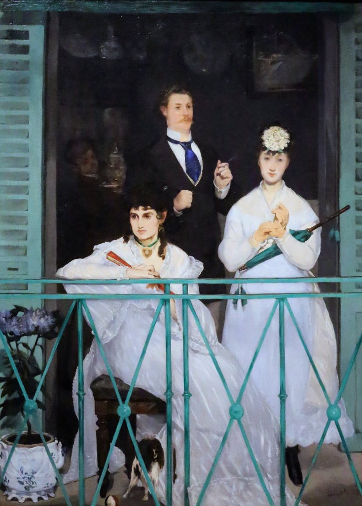 Die starken Kontraste zwischen den weißen Kleidern und dem dunklen Hintergrund, sowie dem schwarzen Anzug, kräftige Farben bei dem Gitter, den Fensterläden und bei der Krawatte, sowie deutliche Pinselspuren waren Dinge, die in den begehrten Salons zu Ablehnungen führten. Dieses Bild wurde jedoch angenommen. Manet lehnt sich bei diesem Bild an Goya an, der mehrere Balkonszenen gemalt hat. Die komplizenhafte Nähe der beiden Frauen bei Goya steht dabei aber im Kontrast zu dem teilnahmslosen Nebeneinander bei Manet.