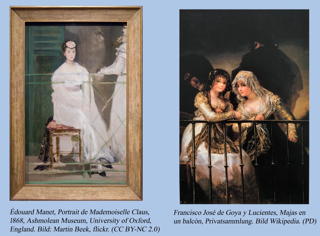 Es gibt zwei weitere Bilder Goyas mit Majas auf Balkonen, eines mit einer ältern Frau, die mit dem Namen „Celestina“ als Kupplerin ausgewiesen wird. Damit werden die beiden Frauen nach spanischem Verständnis als „Fensterfrauen“, also als Prostituierte dargestellt und die rätselhaften dunklen Männer als ihre Zuhälter. Eine solche Charakterisierung ist bei Manet nicht anzunehmen, aber die Funktion eines Balkons in den Bildern ist wohl identisch. Nicht das Hinaus- oder Hinunterschauen wird ins Bild gesetzt, sondern das Gesehenwerden. Die Konkurrenz der beiden Frauen um den vorderen Platz weist ebenfalls darauf hin.