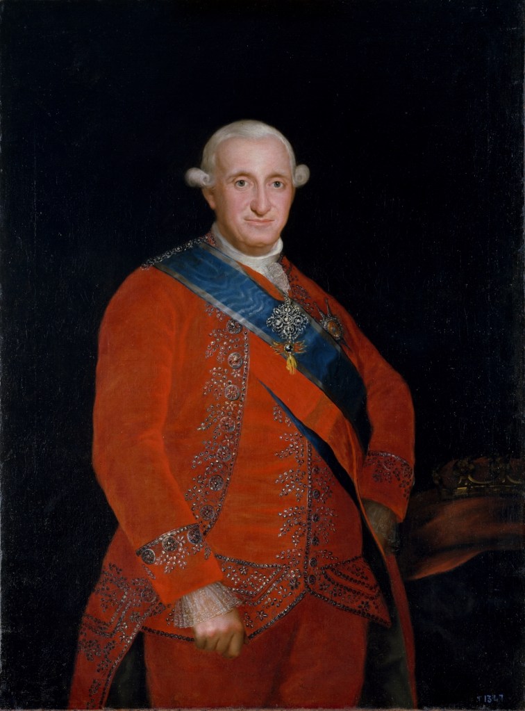 Nach dem aufgeschlossenen, König Karl III., der mit den Gedanken der Aufklärung sympathisierte und die Macht der Kirche einschränkte war sein Sohn, Karl IV. eher phlegmatisch und nicht sehr entscheidungsfreudig. Seine Frau, Maria-Luise von Bourbon-Parma hingegen war machtinteressiert und regierte aus dem Hintergrund. Gegen den oben portraitierten Graf Floridablanca intrigierte sie bereits unter dem vorigen König erfolgreich. Dem König schien es Recht zu sein, er akzeptierte offensichtlich auch ihre Liebhaber, von denen Manuel Godoy später als Erster Staatsminister ihr verlängerter Arm wurde.