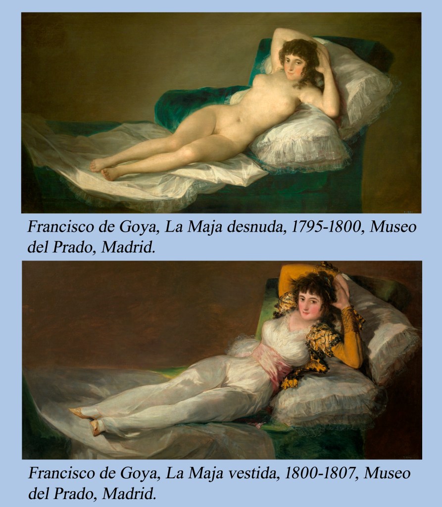 Goya malte zwei beinahe identische Bilder einer liegenden Frau, nur war die erste vollständig nackt und die zweite bekleidet. Die Frau, oder die Frauen, ob es ein und dieselbe ist, oder nicht, ist nicht eindeutig, erhielten die Bezeichnung »Maja«. Damit war eine attraktive junge Frau gemeint, jedoch aus der Unterschicht. Das männliche Gegenstück »Majo« erleichtert die Einordnung. Höher gestellte Frauen ließen sich jedoch eine Zeit lang gerne als Maja darstellen.