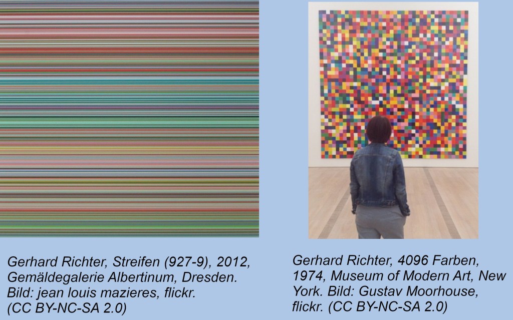 Gerard Richter, 1932 in Dresden geboren ist in vielerlei Hinsicht ein Ausnahmekünstler. Nach einer längeren Phase des Suchens und Experimentierens mit Kontakten zu vielen westlichen Künstlern fand er zu seiner ersten Ausdrucksform, bei der er Bilder malte, die wie verschwommene Fotos wirkten Das bekannteste ist von seiner Frau mit dem Titel „Ema (Akt auf einer Treppe)“ von 1966. Es wird in Zusammenhang gebracht mit einem Bild von Marcel Duchamp, der in „Akt, eine Treppe hinabsteigend“ von 1912 das Problem thematisiert und gelöst hatte, wie man auf einem statischen Bild Bewegung darstellen kann. Zeigen darf ich das Bild nicht, daher nur ein Link: https://www.gerhard-richter.com/de/art/paintings/photo-paintings/nudes-16/ema-nude-on-a-staircase-5778