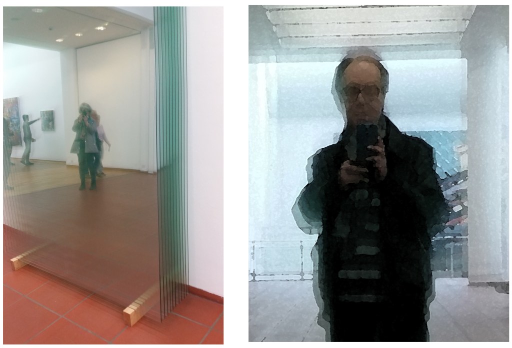 Eine Interpretationshilfe für die Herstellung liefert Richter allerdings durch eine Anzahl dicker Glasscheiben, die er im Museum Ludwig an eine Wand lehnt. Mich selbst durfte ich so aber fotografieren!