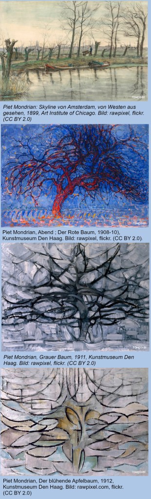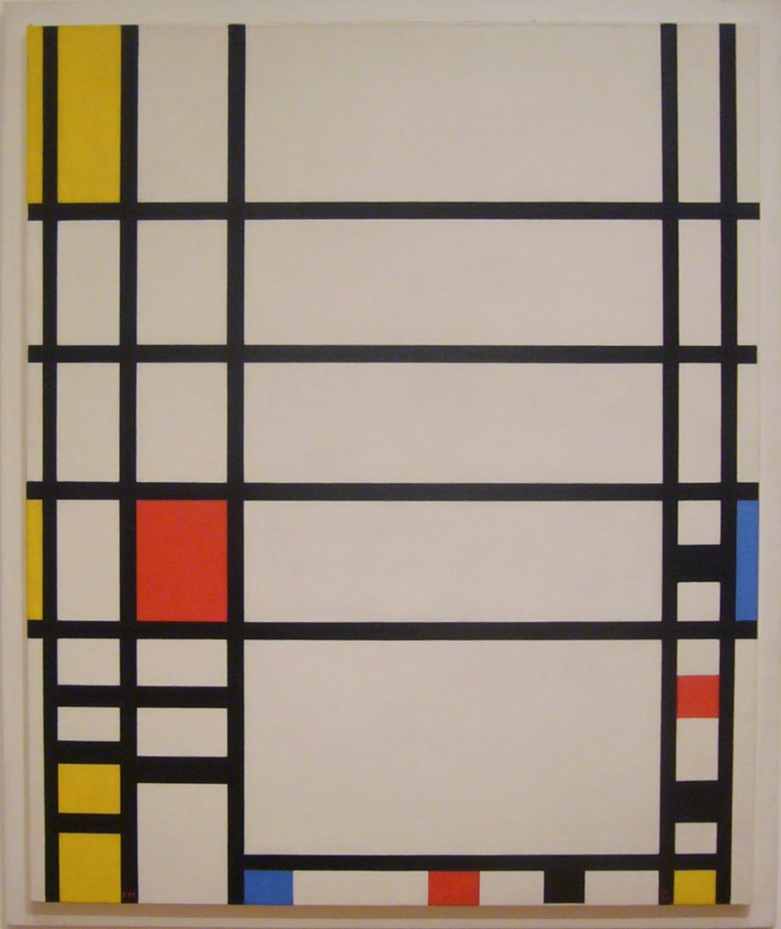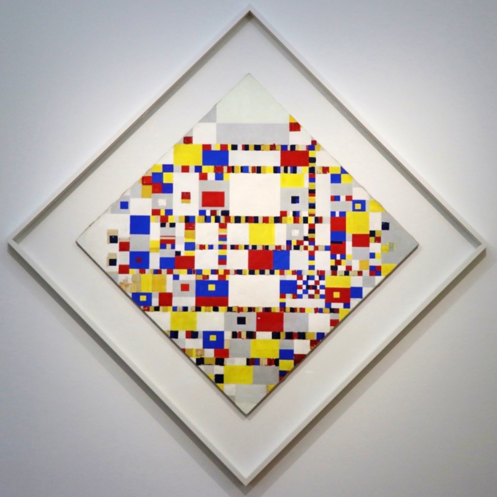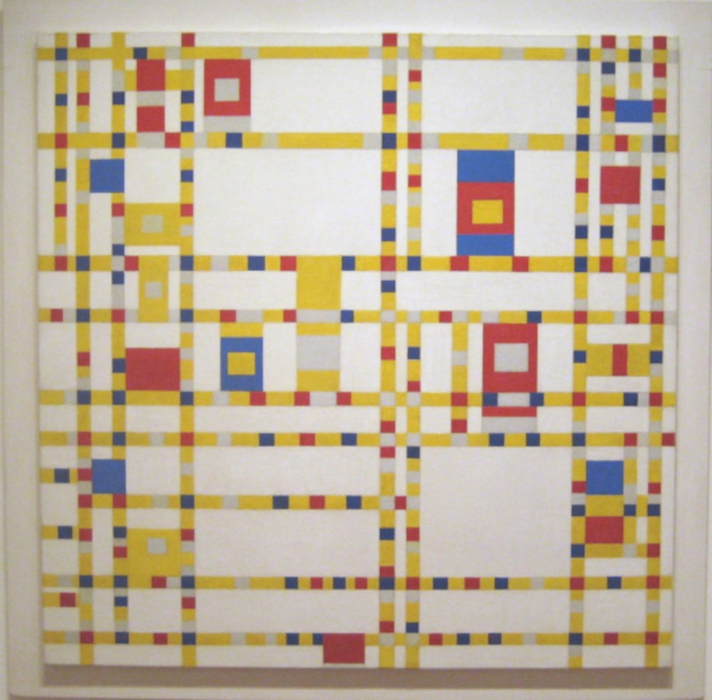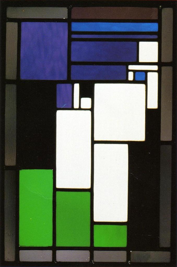 Nach dem Domfenster dachte ich zuerst an Piet Mondrian (1872 – 1944), dem wohl bekanntesten Vertreter von Bildern mit rechteckigen Formen. Seine Malweise entwickelte sich über mehrere Phasen von immer abstrakter werdenden Arbeiten zu den für ihn mittlerweile typischen Rechtecken. Über London floh er nach Amerika, wo er in NewYork zu seiner endgültigen Bildsprache fand.